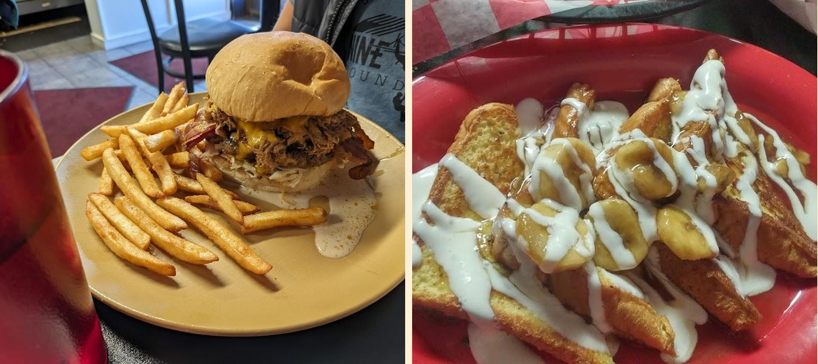The diner serves breakfast, lunch, and dinner. There are burgers, breakfast classics, tacos, and delightful pastries.